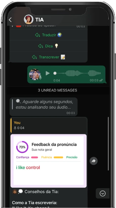 Imagine poder praticar conversação todos os dias, de forma natural, sobre temas que você realmente gosta. A Tia da Idioma está pronta para isso: responde em inglês, te corrige com leveza, estimula frases melhores e faz você internalizar a língua como um nativo faria. Ela se adapta ao seu estilo, aprende com você e vai sempre puxando conversas que te desafiam no nível certo — com feedbacks que fazem você evoluir rápido, sem medo de errar.